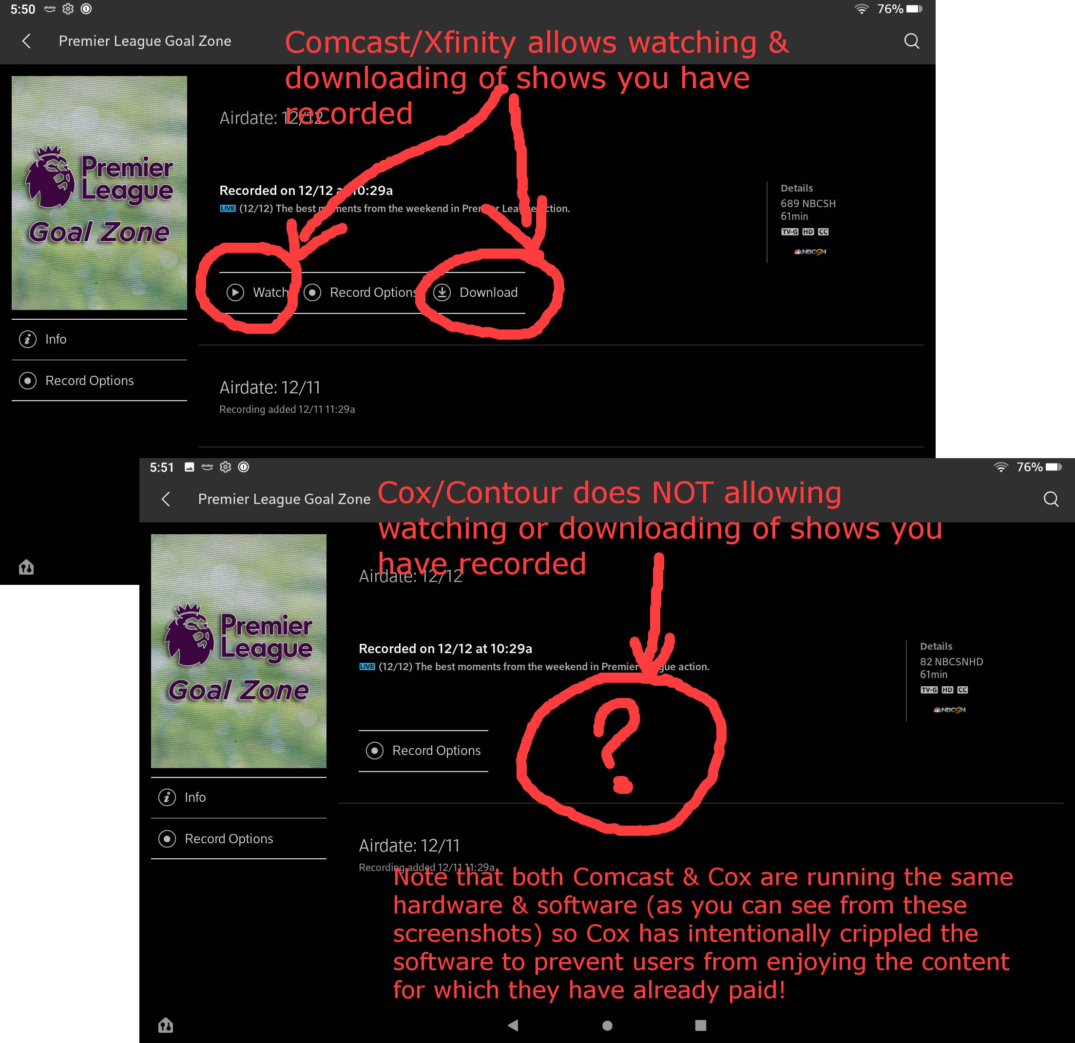 | Cox Support - Please see the two pairs of screenshots below that demonstrate downloading of recorded shows via the Comcast Xfinity app (which is clearly the same as your Cox Contour app) yet the Cox Contour app does not display the "Download" button. |