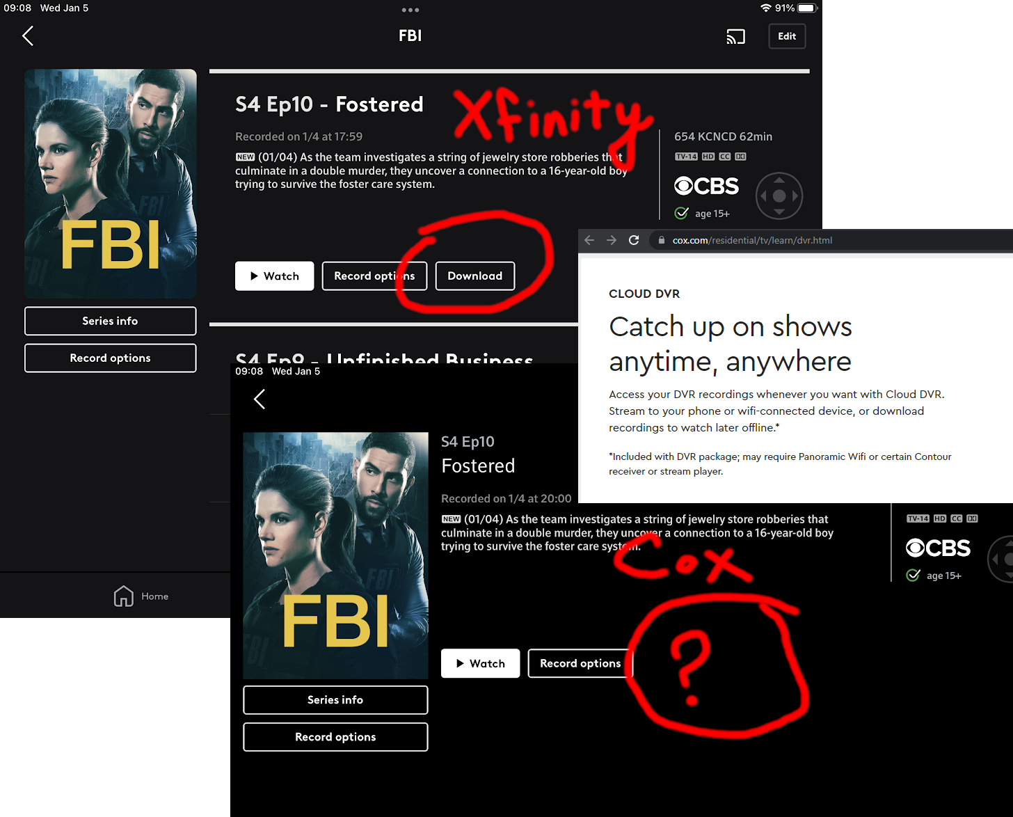 | The second image pair was taken just today (as you can see from the date in the upper left corner of the screenshot) and is showing an episode of FBI that was just recorded via your Cloud DVR service, which I have been told is necessary (previously I was using your hard-drive based DVR). |